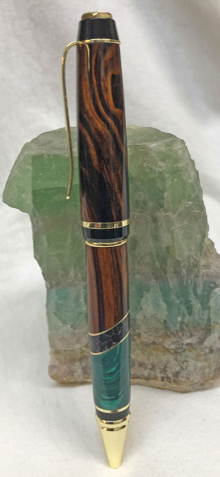 The beautiful body of this pen is made from segments of wood, metal, and stone. The wood is called Desert Ironwood and it came from the Sonoran Desert in Arizona. True to it's name, it is extremely hard and very heavy like iron. The stone segments are Black Marble and green Malachite a mineral that can also be found in Arizona. The metal separating segments are made of brass.